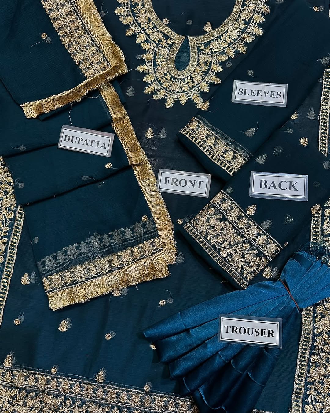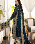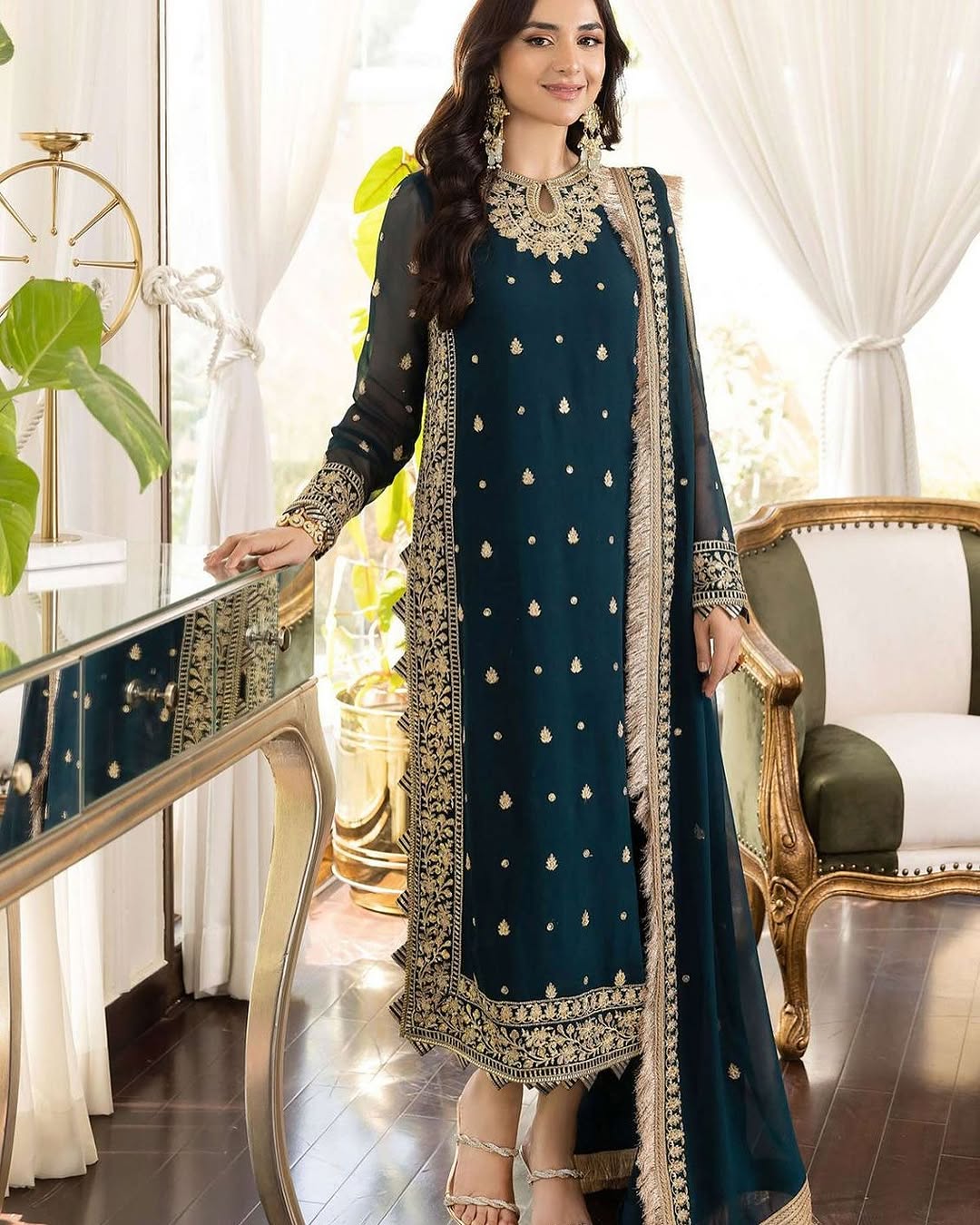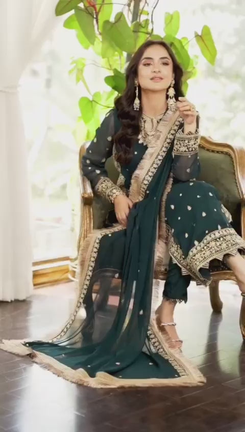 Turn heads with this beautifully designed 3-piece crinkle chiffon outfit, featuring a heavily embroidered front and back shirt that reflects fine craftsmanship. The shirt is detailed with stylish dhanak work on the neckline, daman, and sleeves, giving it a rich and graceful finish. With a 21-inch chest and a 39-inch length, it offers a flattering fit that blends comfort with elegance. Completing the look is a luxurious embroidered dupatta, finished with a two-sided border and four-sided edging, making it the perfect complement to the suit. Crafted from high-quality fabric with exquisite embroidery, this ensemble is an ideal choice for weddings, festive occasions, and formal gatherings.